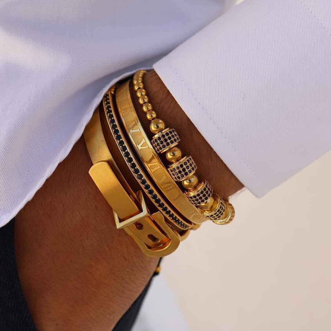 Crafted from high-quality titanium steel, these bracelets feature intricate Roman numerals etched onto the surface. Each bracelet is designed with a sturdy yet elegant horseshoe buckle, ensuring a secure fit on your wrist. The set includes four bangles in varying sizes to create a stunning layered look or gift to someone special.