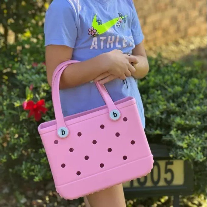 This cute small handbag is perfect for summer outings. Its rubber-like material makes it durable and easy to clean. The bag has an adjustable strap for comfortable carrying, and its compact size fits perfectly into your luggage or beach cart. Use it as a beach bag, picnic basket, or even a shopping tote. Easy to wipe clean after use.
