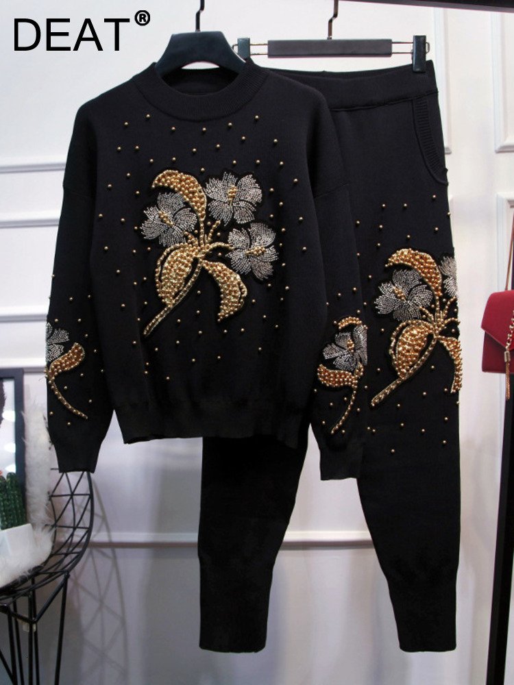 Elevate your fashion game with this charming DEAT Women Two Piece Set. The beading knitted sweater features an elegant design that combines comfort and style, making it perfect for casual wear or lounging at home. The elastic waist long pants offer a relaxed fit for added comfort. This versatile set is crafted with high-quality materials to ensure durability and longevity.