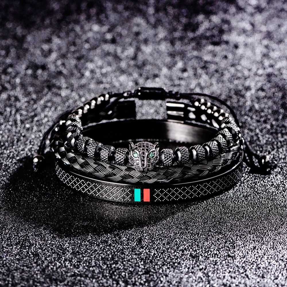 Add a stylish touch to your wrist with this luxury handmade braided bracelet designed specifically for men. Each bead is skillfully crafted with pave cubic zirconia leopard heads in vibrant green and red enamel, set against a polished stainless steel background. The durable braiding ensures long-lasting wear, making it perfect for everyday use or as a unique gift.