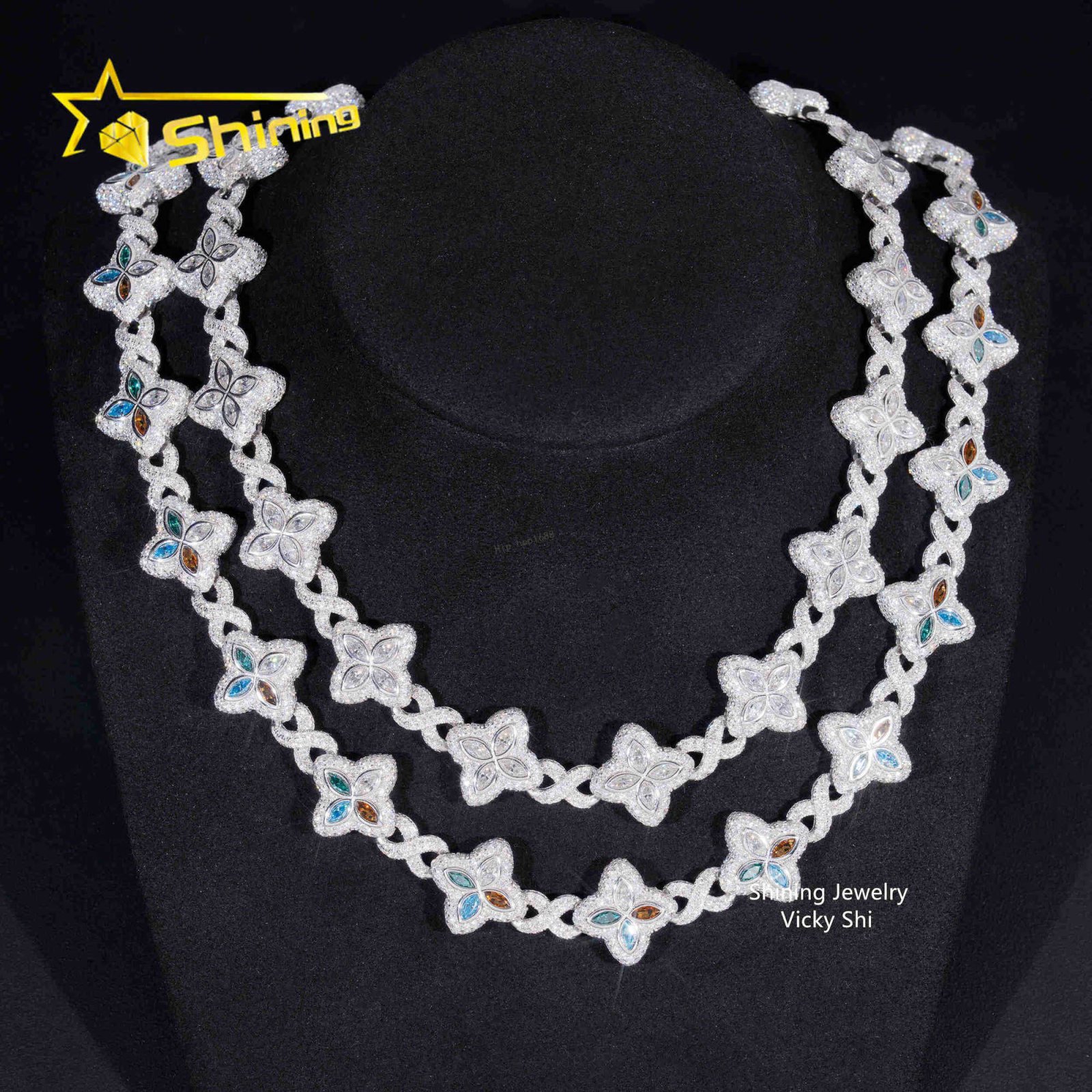 The pendant features a four-leaf clover design set with sparkling VVS moissanite stones. The necklace itself is made of 925 silver, ensuring durability and elegance. The Cuban link chain adds an extra touch of hip-hop flair.